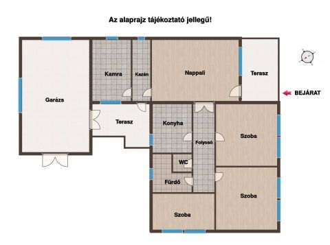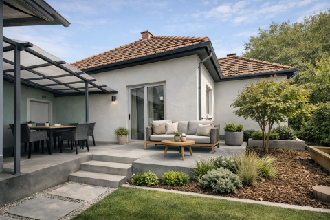 - két fedett terasz: bejáratnál és a hátsó kert felé az épület oldalán