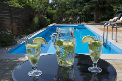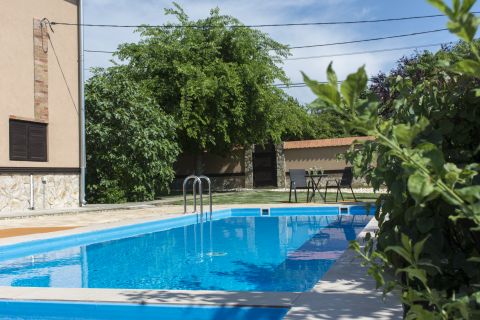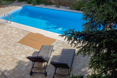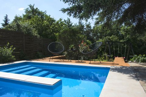 The 899 sqm, well-kept garden is the perfect place for relaxation: a swimming pool, a terrace and a barbecue area serve for relaxation and shared experiences, and the automatic irrigation system ensures the continuous care of the garden.