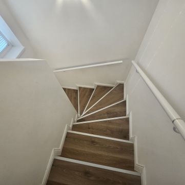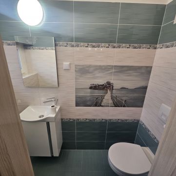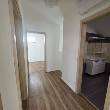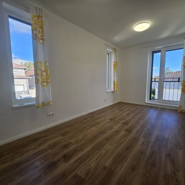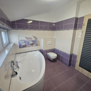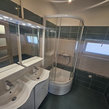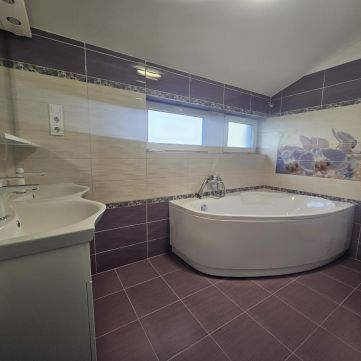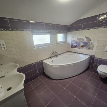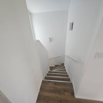 * Emelet: Két nagyobb és egy kisebb, déli/dél-keleti fekvésű szoba. Káddal és két mosdóval felszerelt fürdőszoba WC-vel, mosogató és szárítógép helyével. Hangszigetelő függöny a két szint között, gyermek leesésgátlók a lépcsőn.
