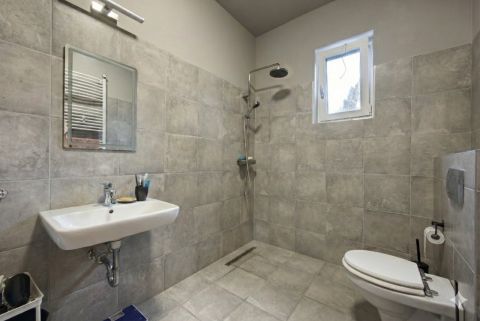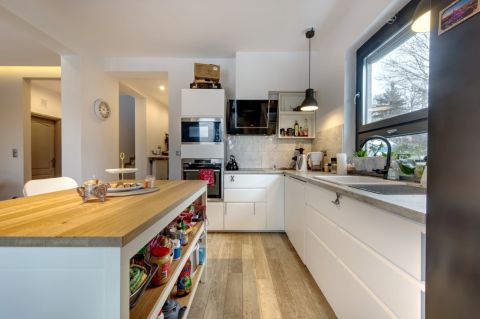 A Porotherm téglából épült, prémium minőségben felújított ház világos, tágas terekkel rendelkezik. Az alsó szinten található a tágas amerikai konyhás nappali, ahonnan közvetlen kijárat nyílik a teraszra és a gondozott kertbe, valamint ezen a szinten helyet kapott egy külön szoba is, amely ideális lehet dolgozószobának, vendégszobának vagy gyerekszobának.