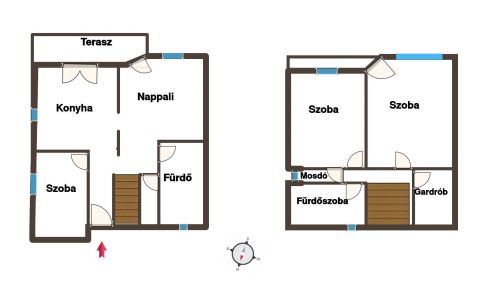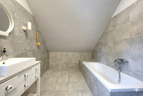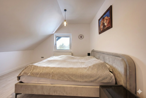 A felső szinten található két hálószoba, melyből az egyikből közvetlen kijárat nyílik a nagy méretű erkélyre, ahonnan lenyűgöző, zavartalan panoráma tárul a Zsámbéki-medencére. Ez a kilátás különleges hangulatot ad a mindennapoknak, legyen szó reggeli kávéról vagy esti pihenésről.