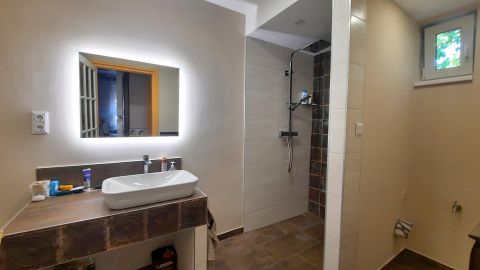 Kialakításra került a tégla építésű családi házban 3 szoba, nappali, konyha, tágas étkező, fürdő és wc. A ház alatt pince található az autó elhelyezésére garázs lett kialakítva, melyhez térkövezett bejáró vezet.