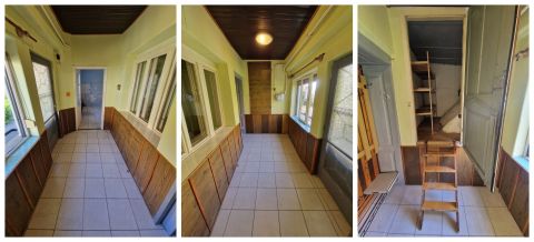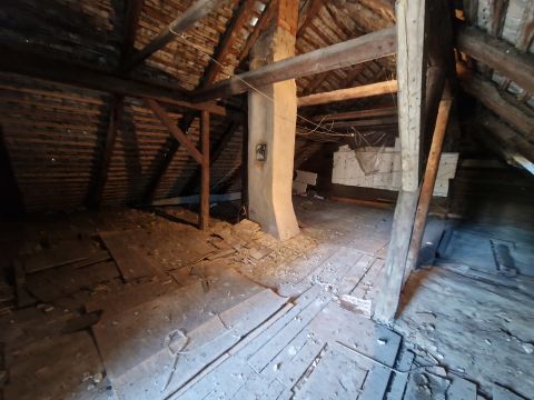 A ház falazata vegyes, lakható, de felújítandó állapotú. Tetőtere beépíthető, mely jelenleg külső lépcsővel megközelíthető és mellette 8 m2-es napozóteraszt alakítottak ki.