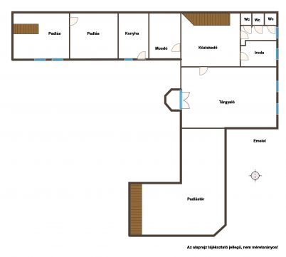 Emelet: teakonyha, 2 irodahelyiség, mosdók, valamint jelenleg tárolásra használt padlásterek