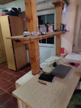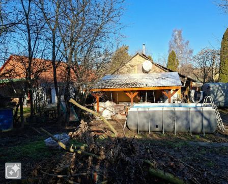 Főépület: 2 szoba, tágas nappali, konyha-étkező, fürdőszoba WC-vel és egy praktikus kamra.