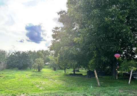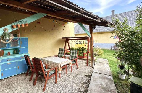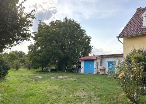 A szépen parkosított kertben gyümölcsfák adnak árnyékot a nyári melegben. Itt található egy garázs és két kerti szerszámok, illetve kerékpár tárolására alkalma sufni is. Az udvar kerítéssel körbekerített. Háziállat tartására alkalmas.