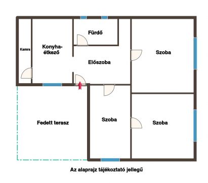 Az ingatlanba nagy fedett teraszon keresztül jutunk, ahol egy előszoba fogad minket. Balra konyha-étkező, spejz, szemben fürdőszoba WC, jobbról pedig három szoba került kialakításra.