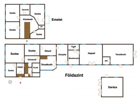 - Földszint: előszoba, 2 szoba, tágas nappali, 2 konyha, étkező, spájz, fürdőszoba külön wc-vel, fürdőszoba wc-vel, télikert, fűtött közösségi tér (36m2)