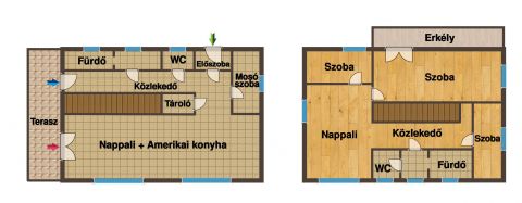 - 140 m2-es lakótér, amerikai konyha + 2 nappali, 3 szoba, 2 fürdő, 2 WC, mosószoba, tároló, erkély, terasz