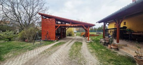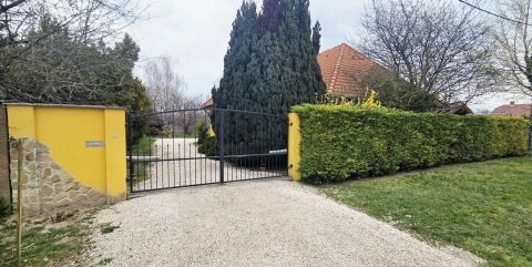 Az ingatlan már első pillantásra lenyűgöz: esztétikus, épített kerítés, elektromos kapu, valamint két autó számára kialakított fedett kocsibeálló biztosítja a kényelmet és biztonságot.