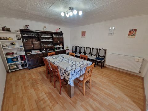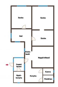 Található benne 3 szoba, hall, nappali-étkező, konyha, fürdő/wc, közlekedő, kamra, illetve beépített terasz és nyári konyha.