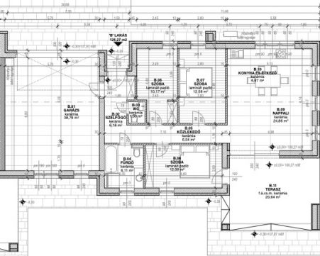 -- nappali-konyha-étkező, 3 hálószoba, fürdőszoba, WC, közlekedő, előtér, garázs