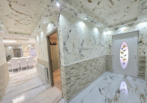 A nappali különleges hangulatát a falakon végigfutó, márványmintás design folyékony tapéta adja.