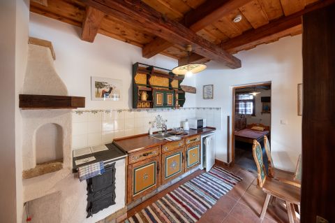 Az ingatlan természetes anyagok felhasználásával készült: fagerendás födém, hagyományos teatűzhely, cserépkályha, eredeti, kézzel festett, helyi népművészeti és ősmagyar népi mintákkal díszített fa bútorok, helyben előállított kerámia-lámpák, a tornác faragott oszlopai, autentikus környezetet teremtenek az idelátogatóknak.