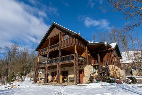 A családi ház: A ház hangulatát meghatározza a fa jelenléte, természetessége. Az ingatlan három szintes. Összesen kb. 500 m2 bruttó alapterülettel és 7800 m2 telekkel rendelkezik. Az épület 2004-ben épült, Finnországból érkezett kiváló minőségű faanyagból. Az ingatlan stabil alapra épült, melyen a többszintes fenyő rönkszerkezet nyugszik.