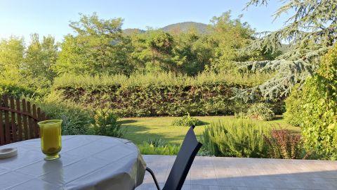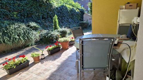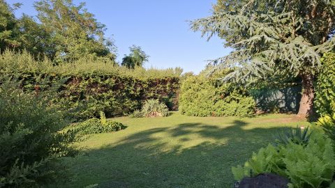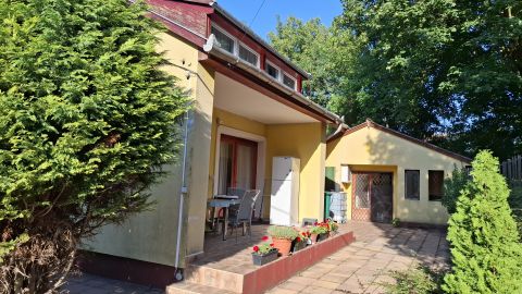 Az ingatlan a település csendes mellékutcájában található, csak egy kertszomszéddal. A 854 m2-es összközműves, bekerített, összességében sík telek csodálatosan parkosított különleges fenyőkkel, szépen gondozott bokrokkal, sziklakerttel, épített sütögetővel.