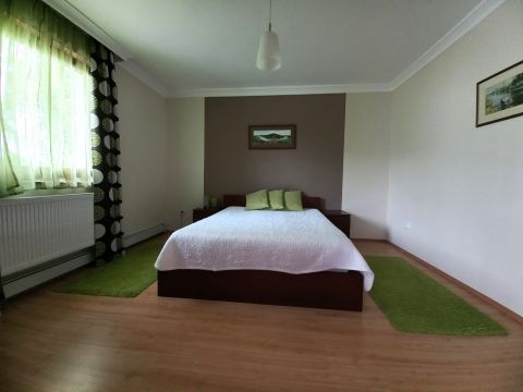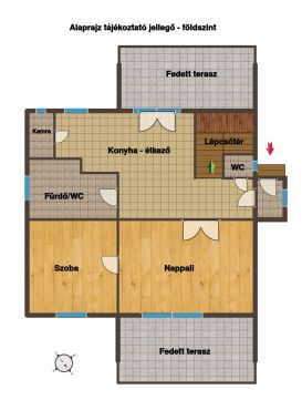 A földszinten található egy tágas nappali elegáns kandallóval, egy hálószoba, kényelmes konyha-étkező, kamra és WC-s, kádas fürdőszoba. A nappaliból és az étkezőből is egy-egy nagy méretű fedett terasz nyílik, PANORÁMÁVAL a Szent Mihály hegyre és Visegrádra is.