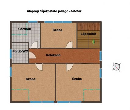 A tetőtérbe egy kényelmes Harry Potter fülkével ellátott fa lépcsősor vezet fel, ahol a közlekedőből három nagyméretű, padlószőnyeggel burkolt szoba, egy gardrób helyiség és egy WC-s, zuhanyzós fürdőszoba nyílik.
