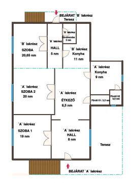 'A' lakás (75 nm): 2 tágas szoba (20 és 19 nm), hall, konyha-étkező és 2 kisebb fürdőszoba.