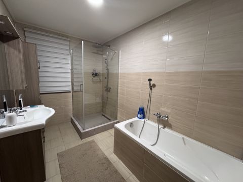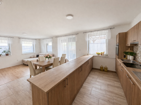A tágas, világos nappaliból egy nagy, fedett terasz nyílik, amely ideális családi és baráti összejövetelekhez.