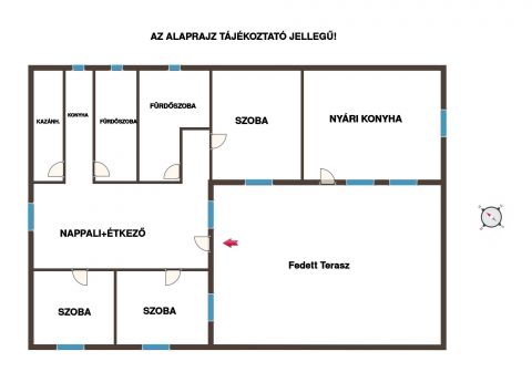 Az ingatlan elrendezése kifogástalan. Három tágas szoba, egy hatalmas, 51 nm-es nappali és étkező, egy jól felszerelt konyha, két fürdőszoba és egy közlekedő található benne. Ezen kívül egy nyári konyha is helyet kapott, amely szintén felújított, és tökéletesen alkalmas a nyári hónapokban történő főzésre és vendéglátásra.