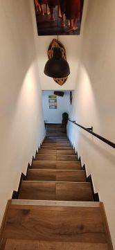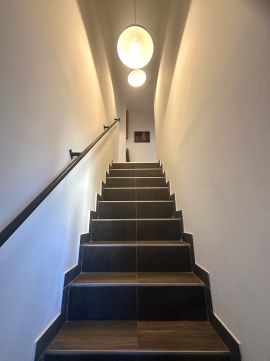 A nappali végében a ház lépcsőháza található, mely lefele a pincébe vezet, felfele pedig a beépített tetőtér szintre.