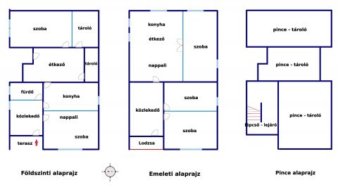 -     nappali, 3 szoba, fürdőszoba,  wc, előszoba, közlekedő, konyha étkező, 2 tároló