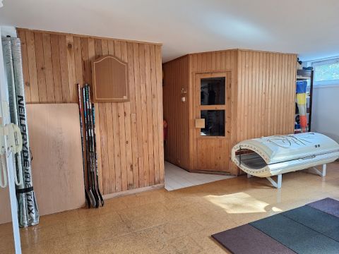 A ház alatt két autó számára teremgarázs, ebből nyílik egy konditerem, szauna, szolárium, mellette zuhanyzó, wc, mosó és szárító, valamint kazán és tároló helyiségek találhatók. Innen belső lépcső vezet az első szintre.