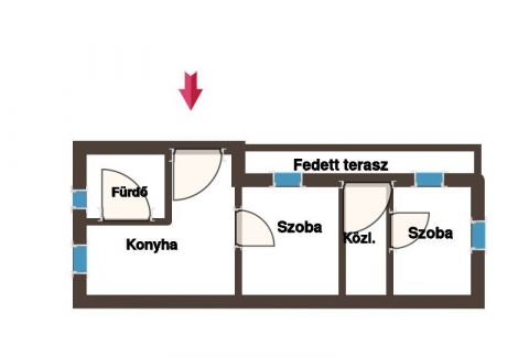 Az ingatlan elosztása : kettő szoba, közlekedő, fürdőszoba, konyha, valamint egy fedett veranda.