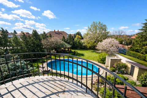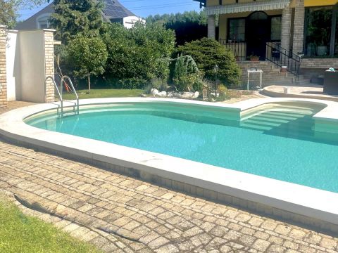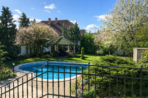 A gondosan kialakított, teljes intimitást nyújtó kert zöldfelületei, árnyékot adó fái és a medence valódi nyári élettérré teszik az udvart. A terasz és a kert ideális helyszíne családi étkezéseknek, baráti összejöveteleknek vagy csendes, elvonulós pihenésnek. A körbekerített telek a nap minden szakában biztosítja a zavartalan privát szférát.