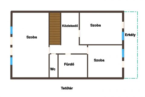 A lakószinten 2 szoba, nappali, konyha, étkező, kamra, fürdőszoba és egy wc található. Az építtető kívánsága szerint a tetőtér a lakástól függetlenül, külön bejárattal is elérhető. Itt további 3 szoba, fürdő és egy wc kapott helyet.