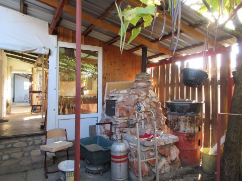 A épülethez közvetlenül kapcsolódik fedett terasz, valamint nyárikonyha és melléképületek.