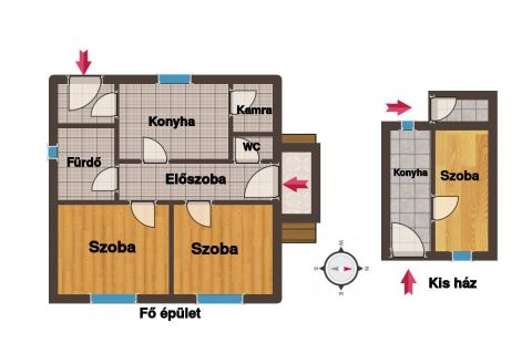 A családi házban két nagy hálószoba, egy nagy fürdőszoba, egy különálló WC, egy nagy étkező-konyha, egy kamra, valamint egy padlásfeljárót is magába foglaló háztartási helyiség található. Az ingatlan két bejárattal rendelkezik, a padlás padlózata a vasbeton födém miatt járható, majdnem teljes egészében teljes belmagasságú, így a tetőtér beépítésével egy külön lakrész kialakítására van lehetőség! A padlástérbe a villany fel van vezetve, de természetes fényt biztosít egy közepes méretű ablak is. A tető, valamint a ház szerkezete tökéletes állapotban van, azonnal költözhető! Az ingatlan jó alapot biztosít, hogy egy szép modern, minden igényt kielégítő otthont, varázsoljanak belőle, ahol az akár több generációs család és a munkahely is együtt, de mégis szeparáltan életteret kap! A biztonságot a főépületben, valamint a melléképületben egyaránt riasztó, valamint távfelügyelet biztosítja. Az étkező-konyhában műanyag, a többi helyiségben fa nyílászárók, redőny és szúnyogháló van. A meleg vízről elektromos bojler, a fűtésről gázkonvektor gondoskodik. A kerten belül a kocsibeállási lehetőség biztosított!