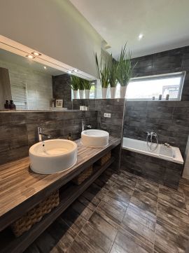Az ingatlan 2015-ben készült,magas műszaki tartalommal és minőségi kivitelezéssel,amelynek a lakóterülete két szinten 94 nm,amelyhez tartozik egy 15 nm-es garázs és az udvaron,a viacoloros burkolattal ellátott részen két autó részére udvari beálló,illetve a ház udvari frontján található egy 27 nm-es terasz,amelyet a tulajdonosok egy zárható és fűthető télikertté varázsoltak.A ház alsó szintjén került kialakításra az előszobából belépve a kézmosós toalett és teljesen modern,egy légterű 35 nm-es nappali+amerikai konyha.A felső szinten három hálószoba,gardrób szoba és egy fürdőszoba található.