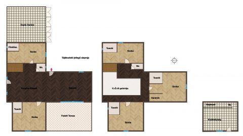 Elrendezése praktikus, a földszinten nappali+konyha+étkező, kettő hálószoba, az emeleten pedig további három hálószoba van.