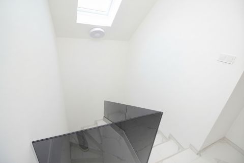 A földszinten egy tágas, világos konyhaétkező került kialakításra, valamint egy különleges adottságú, igényesen kialakított fürdőszoba található. A prémium minőségű, egyedi tervezésű konyha teljesen felszerelt, a beépített gépekkel együtt a vételár részét képezi. Az emeleten három hálószoba és egy külön WC kapott helyet.