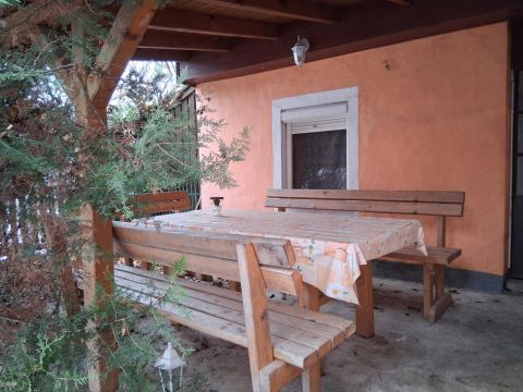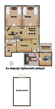 Téliesített, 12 m2-es teraszon keresztül jutunk be a házba, és egy 10 m2-es kisebb szobába is. A nappaliból a 8 m2-es fedett teraszra lépünk ki, ami a külvilágtól elszeparált, így a család részére meghitt beszélgetések, étkezések színtere lehet.