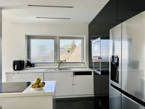 The house has sunny, spacious spaces and it conquers both with its impressive panoramic view. It is heated using a modern heat pump system, which is not only environmentally friendly, but it is also an economic solution.The paving stone in front of the garage is heated, so you don't have to worry about frozen, slippery surfaces even in winter.