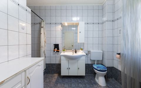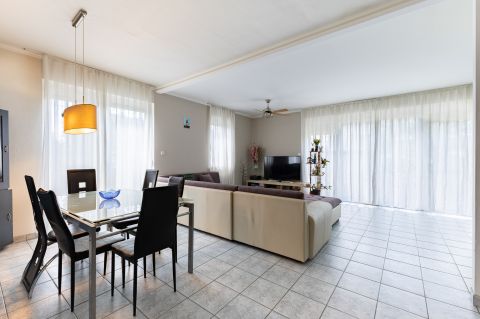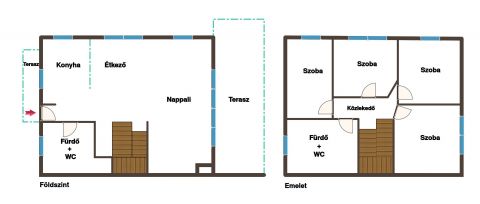 Belépve azonnal, az igazán különleges méretű, 58 nm-es amerikai konyhás nappaliba érkezünk. A tágas, világos helyiség igazi kuriózummá teszi az ingatlant, mert nagyon kevés házban találni ilyen, szinte egész lakás méretű, egybefüggő teret. A nappaliból közvetlen kertkapcsolatos, 20 nm-es nyitott terasz érhető el. A bejárati ajtó mellett a földszinti, zuhanyzós vizesblokk kapott helyet. A szint helyiségei még az építéskorabeli kerámia lapokkal burkoltak, belmagasság 2,7 méter.