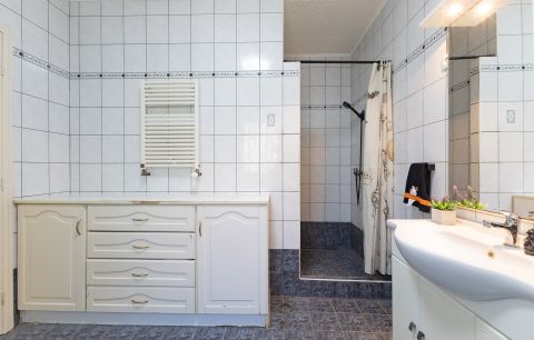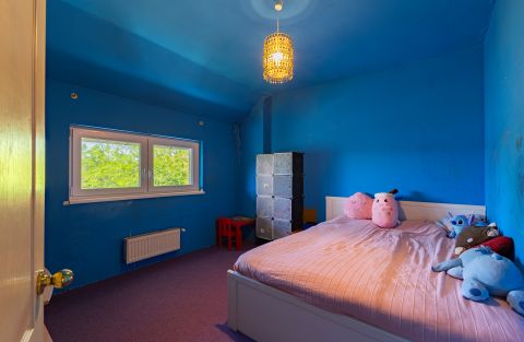A tetőn 18 db napelem biztosítja a ház energiahatékony fenntartását. Elektromos autó töltésére, töltő kiépítés után, a pincében kerülhet sor.