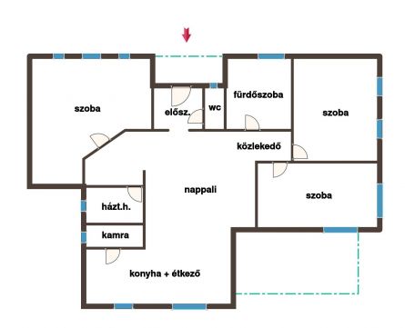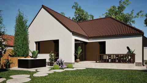 A praktikus elosztásnak köszönhetően az otthon 4 szobát kínál, amerikai konyhás nappalit - étkezővel, 3 hálószobát, fürdőszobát, háztartási helyiséget, kamrát, előszobát és egy burkolt teraszt.