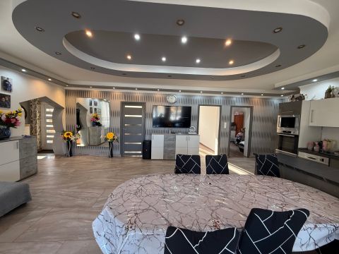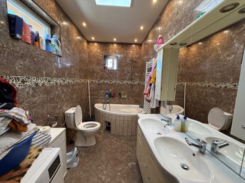 A ház 3 szoba + amerikai konyhás nappalis (szobák: 15,5, 13,5, 12,5 m2; 44 m2 nappali; előszoba, fürdőszoba WC-vel, külön WC, + teraszok: 30 m2 és 1,5 m2 ) nettó 97 m2