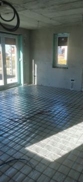 Központi levegővíz hőszivattyú, padlófűtés minden helyiségben, fan-coil hűtés/fűtés a nappaliban és az emeleti szobákban