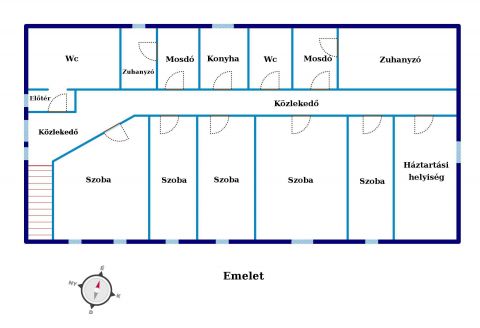 A földszinti szobák egy részéhez külön-külön fürdő, a többi szobához közös fürdő, wc és egy nagy közösségi tér is tartozik, mely önmagában 60 nm.