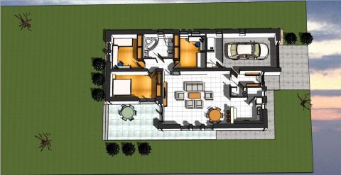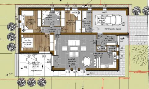 A ház elrendezése nagyvonalú, átlátható és könnyen bútorozható, felesleges közlekedők nélkül. A nappali és terasz egyidejű használata kulturált, elegáns átmenetet teremt külső és belső élettér között.