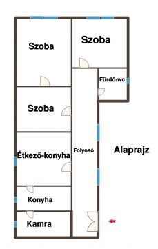 Helységek:3-szoba, étkező, fürdőszoba-wc, folyosó, főzőfülke, kamra.