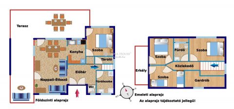 - alsó szinten található az előtér, nappali-étkező, konyha, fürdőszoba, a lépcső alatti tároló, és két terasz.