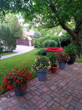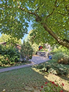 A tágas, vadregényes kertben gyümölcsfák, árnyat adó diófák, tűzrakóhely, medencének való hely került kialakításra, valamint utcafrontján fedett dupla gépkocsibeálló is megtalálható.