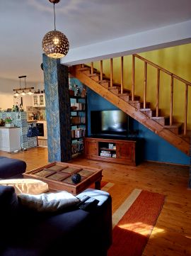 *a földszinten tágas amerikai konyhás nappali, szülői hálószoba saját fürdővel, mosókonyha, valamint kertkapcsolatos, hangulatos terasz található.