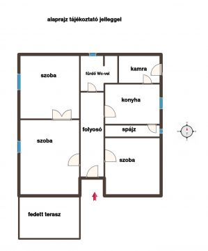 spájz és folyosó. A ház elött egy kb 12 nm-es fedett terasz van. Egyéb gazdasági épületek vannak.